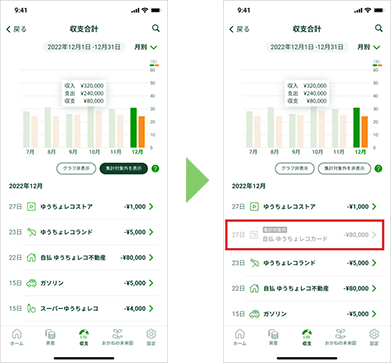 ・「カード引き落とし」:クレジットカードと銀行口座を両方ゆうちょレコに登録されている場合、カードの利用明細と銀行口座からの引き落とし明細で支出が二重に計上されることを防ぐため、銀行口座の引き落とし明細に対して設定してご利用ください。